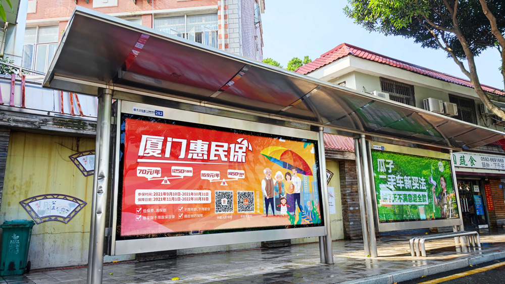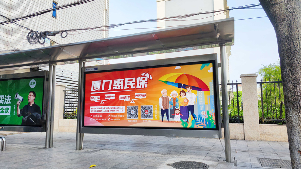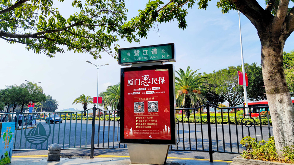 目前“惠民保”在全廈門市島內(nèi)外各個主干道及主干道交叉口、黃金的人流車流途徑處、居民生活住宅區(qū)等路段投放多個城市路名牌、公交車候車亭。